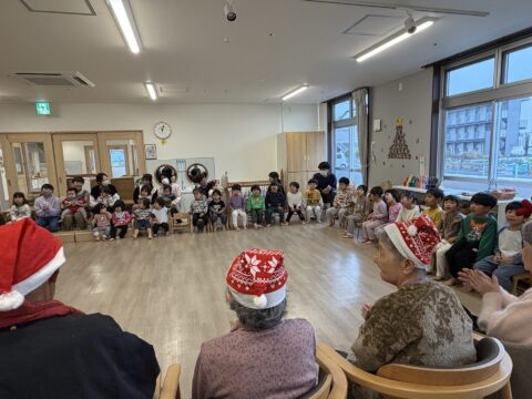 「♪メリークリスマス!」という子どもたちの元気な声から始まった、ゆずっこ保育園とデイサービスゆずっこ高西との合同クリスマス会。