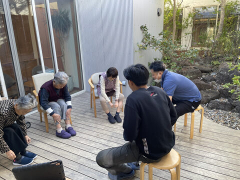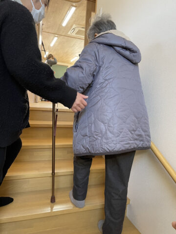 「階段を登れるかな」と不安を口にされていた利用者様も、応援上手なケアスタッフに励まされながら、みなりっこの朝活である「テラスでの体操」や「生活リハビリ(踏み台昇降・杖歩行)」の成果を発揮。